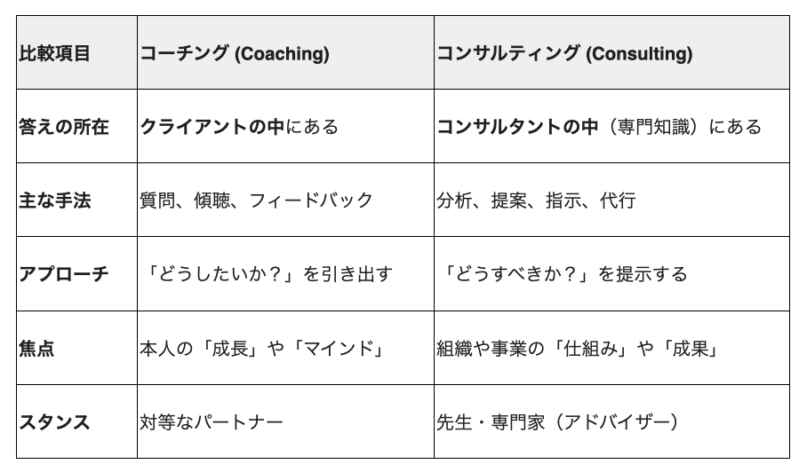 コンサルタントが「魚の釣り方(マニュアル)を教える、または代わりに釣ってあげる」人だとすれば、コーチは「なぜ魚を釣りたいのかを明確にし、本人が自分なりの釣り方を見つけるのをサポートする」人です。